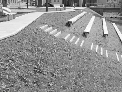 AUF HÖHE DER BRÄUNLINGER STADTHALLE TRIFFT DER BEREICH DER INNENSTADTSANIERUNG AUF DIE HOCHWASSERSCHUTZVORKEHRUNGEN DES BRÄNDBACHS. DER TECHNISCH NOTWENDIGE NEUE DAMM WIRD ZUR PROMENADE ENTLANG DES BRÄNDBACHS AUFGEWERTET. SITZGELEGENHEITEN LADEN AUF DEM NACH SÜDEN AUSGERICHTETEN UFERBEREICH ZUM VERWEILEN EIN.
