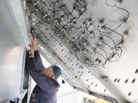 DER ORT FÜR DAS GEDENKEN AN DIE GEFALLENEN DER WELTKRIEGE WIRD VOM FRIEDHOF AN DIE KIRCHE VERLEGT. FEINE BOHRUNGEN IN DER METALLISCHEN OBERFLÄCHE DER GEDENKTAFEL BILDEN KONZENTRISCHE KREISE, DIE DIE OFTMALS WEITAB VON BRÄUNLINGEN GELEGENEN ORTE DES TODES SYMBOLISIEREN. NACHTS LEUCHTEN DIE PUNKTE ZUR ERINNERUNG UND MAHNUNG.