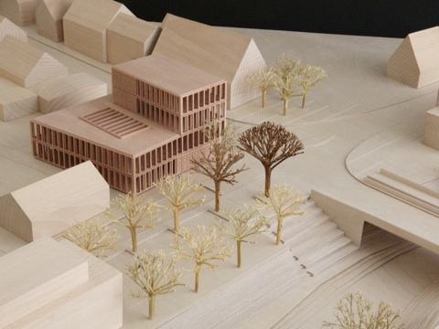 DER NEUBAU DES KOMPETENZCENTERS SÜSSEN DER KREISSPARKASSE GÖPPINGEN VERSTEHT SICH ALS BRÜCKENKOPF AM FILSÜBERGANG, DER DIE STADTTEILE BEIDSEITIG DES FLUSSES VERBINDET. DIE VIERGESCHOSSIGE STRASSENBEGLEITENDE BEBAUUNG KORRESPONDIERT MIT VERGLEICHBAREN BAUKÖRPERN ENTLANG DER ANGRENZENDEN STRASSENZÜGE UND VERSCHAFFT DEM NEUBAU EINE ANGEMESSENE PRÄSENZ IM STRASSENBILD. ZU DEN RÜCKWÄRTIGEN GRUNDSTÜCKEN GELINGT AUFGRUND DER REDUZIERUNG DER BAUMASSE AUF ZWEI GESCHOSSE EINE HARMONISCHE EINFÜGUNG INS UMFELD. EIN NATURSTEINTEPPICH VERBINDET DAS KOMPETENZCENTER ÜBER DIE FILSSTRASSE ZUM FLUSSUFER. EINE GROSSZÜGIGE TERRASSIERUNG VERSCHAFFT DER ÖFFENTLICHKEIT ZUGANG ZUM MOMENTAN VERWILDERTEN GRÜNZUG. DER GRUNDRISS DES NEUBAUS IST GEMÄSS DEN ERFORDERLICHEN ABLÄUFEN EINES MODERNEN DIENSTLEISTERS ÜBERSICHTLICH UND TRANSPARENT ORGANISIERT. DIE VERTIKAL GEPRÄGTE FASSADE AUS BETONFERTIGTEILEN VERLEIHT DEM GEBÄUDE EIN SIGNIFIKANTES ERSCHEINUNGSBILD. ALLE INNENRÄUME SOLLEN MIT EINEM FREUNDLICHEN HELLEN HOLZWERKSTOFF VERKLEIDET WERDEN.