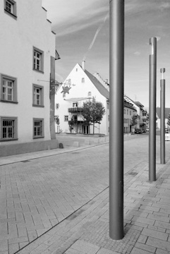 DER KELNHOFPLATZ IST DIE KEIMZELLE DER STADT BRÄUNLINGEN. HIER STAND IM FRÜHEN MITTELALTER DIE ORTSBURG. DAS DENKMALGESCHÜTZTE GEBÄUDE DES KELNHOFMUSEUMS SOWIE RESTE DES EHEMALIGEN  BURGZUGANGS DOMINIEREN DEN STADTRAUM. EIN EINHEITLICHER GRANITBELAG VON HAUS ZU HAUS STÄRKT DEN NEU GEWONNENEN PLATZ. DER EHEMALIGE BURGZUGANG WURDE DURCH DIE ERGÄNZUNG MIT ZUSÄTZLICHEN STUFEN UND SITZBLÖCKEN GESTÄRKT UND IST NUN DER DREH- UND ANGELPUNKT DES PLATZES. DER FÜR DIE FASNET WICHTIGE ORT DES HEXENFEUERS WIRD DURCH EINEN KREIS AUS ALTEM WACKENPFLASTER ERLEBBAR GEMACHT. DREI LICHTSTELEN MARKIEREN DAS NICHT MEHR EXISTENTE EHEMALIGE WALDTOR UND SIGNALISIEREN DEM AUTOFAHRER DEN ZUGANG ZUR ALTSTADT.