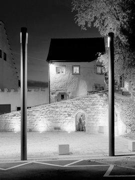 DER KELNHOFPLATZ IST DIE KEIMZELLE DER STADT BRÄUNLINGEN. HIER STAND IM FRÜHEN MITTELALTER DIE ORTSBURG. DAS DENKMALGESCHÜTZTE GEBÄUDE DES KELNHOFMUSEUMS SOWIE RESTE DES EHEMALIGEN BURGZUGANGS DOMINIEREN DEN STADTRAUM. EIN EINHEITLICHER GRANITBELAG VON HAUS ZU HAUS STÄRKT DEN NEU GEWONNENEN PLATZ. DER EHEMALIGE BURGZUGANG WURDE DURCH DIE ERGÄNZUNG MIT ZUSÄTZLICHEN STUFEN UND SITZBLÖCKEN GESTÄRKT UND IST NUN DER DREH- UND ANGELPUNKT DES PLATZES. DER FÜR DIE FASNET WICHTIGE ORT DES HEXENFEUERS WIRD DURCH EINEN KREIS AUS ALTEM WACKENPFLASTER ERLEBBAR GEMACHT. DREI LICHTSTELEN MARKIEREN DAS NICHT MEHR EXISTENTE EHEMALIGE WALDTOR UND SIGNALISIEREN DEM AUTOFAHRER DEN ZUGANG ZUR ALTSTADT.