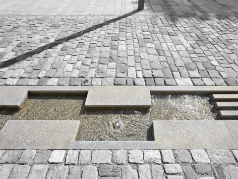 DIE ÖSTLICHE ZÄHRINGERSTRASSE ZWISCHEN MÜHLENTOR UND KATHOLISCHER KIRCHE IST DER AM STÄRKSTEN FREQUENTIERTE BEREICH DER STADT BRÄUNLINGEN. ES BESTAND EIN DRINGENDER BEDARF AN AUSGEWIESENEN PARKPLÄTZEN, EINER AUSGEBAUTEN BUSHALTESTELLE INKLUSIVE ÜBERDACHUNGEN SOWIE EINES DURCHGÄNGIGEN GEHWEGS. DAS MÄCHTIGE ERSCHEINUNGSBILD DER KIRCHE WIRD DURCH DIE NEUE TREPPENANLAGE DES KIRCHPLATZES AUFGEFANGEN UND IN DAS UMFELD EINGEBUNDEN. EIN ERHÖHTER PLATZBEREICH DIREKT VOR DER KIRCHE UNTERSTREICHT DIE PROMINENZ DES ORTES UND WIRKT WIE EINE TRIBÜNE IM STÄDTISCHEN LEBEN. EINE WASSERRINNE AUF DER GEGENÜBER LIEGENDEN SEITE ERINNERT AN EINEN PRÄHISTORISCHEN BACHLAUF DER EINST DIESEN BEREICH QUERTE.