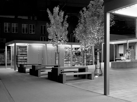 EINE FLÄCHE AUS HELLEN GRANITPLATTEN, BEBAUT MIT DREI NEUEN MARKTSTÄNDEN SOWIE DEM FLEISCHHALLENVORDACH, BILDET DEN NEUEN MARKTBRUNNENPLATZ AUF DEM AUGSBURGER STADTMARKT. EINEN KONTRAPUNKT ZU DEN KOMPLEXEN TECHNISCH- UND NUTZUNGSBEDINGTEN VORGABEN SETZT DIE RUHIGE ARCHITEKTURSPRACHE DER RAUMBILDENDEN STAHL- GLASÜBERDACHUNGEN, DEREN TRANSLUZENTE SPANNDECKE TAGSÜBER UND IN DEN ABENDSTUNDEN DEN VERKAUFSFLÄCHEN ANGENEHMES LICHT SPENDET. DIE DARUNTER ANGEORDNETEN FASERZEMENTVERKLEIDETEN MASSIVHOLZBOXEN SPIEGELN IM ERSCHEINUNGSBILD IHRE JEWEILIG INDIVIDUELLE NUTZUNG WIDER.