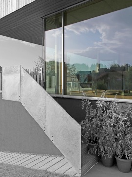 TROTZ EINHALTUNG WESENTLICHER GESICHTSPUNKTE DES RIGIDEN BEBAUUNGSPLANS VERKÖRPERT DAS EINFAMILIENHAUS INKLUSIVE KLEINER BÜROEINHEIT IM GEGENSATZ ZUR ORTSÜBLICHEN BEBAUUNG EINE EIGENSTÄNDIGE ARCHITEKTURSPRACHE. SIGNIFIKANTE DACHÜBERSTÄNDE NACH OST UND WEST VERLEIHEN DEM GEBÄUDE EIN PLASTISCHES ERSCHEINUNGSBILD. DIESER EINDRUCK WIRD DURCH DIE HOMOGENE VERKLEIDUNG MIT EINER VERTIKALEN HOLZVERSCHALUNG GESTÄRKT. UM MÖGLICHST VIEL GRÜNFLÄCHE ZU ERHALTEN, WURDE DIE DOPPELGARAGE IN DIE HAUSKUBATUR INTEGRIERT. DAS UMFANGREICHE RAUMPROGRAMM VERTEILT SICH ÜBER DREI GESCHOSSE. IM INNEREN IST DER DREH- UND ANGELPUNKT DAS WEITLÄUFIGE WOHN- UND ESSZIMMER. EINE GROSSZÜGIGE ÜBER- ECK- VERGLASUNG ÖFFNET DEN BLICK AUF DAS NAHE LIEGENDE BERGPANORAMA DER BAYRISCHEN ALPEN.