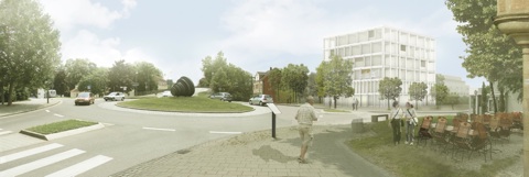 DIE GERINGE GRUNDFLÄCHE KOMMT EINER GROSSZÜGIGEN FREIANLAGENGESTALTUNG ZU GUTE UND BEWAHRT ALLE PROJEKTIERTEN STÄDTEBAULICHEN OPTIONEN FÜR DIE ZUKUNFT.